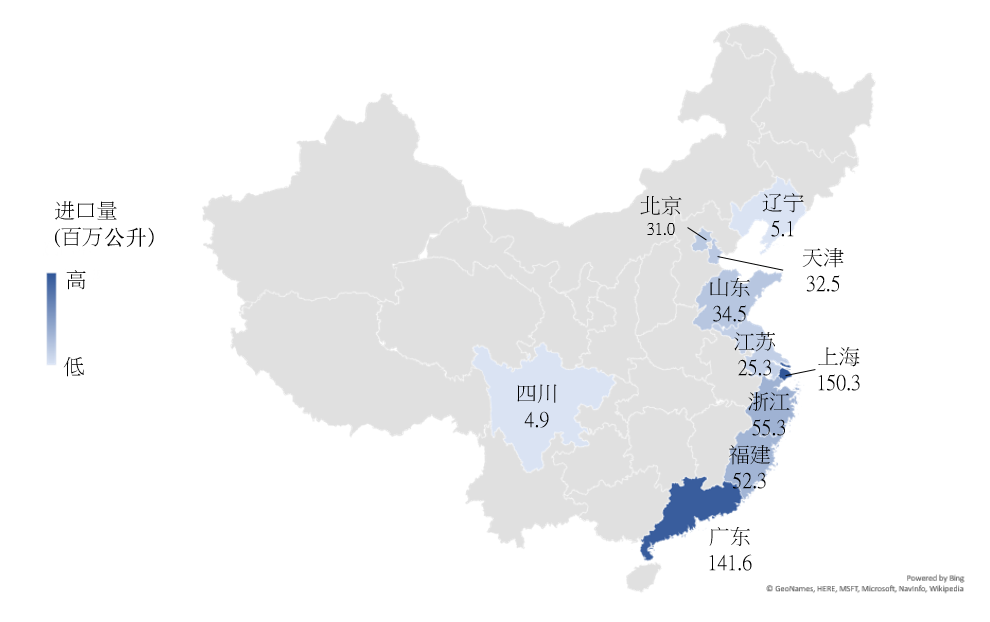 鉴于中国东部城市日益繁荣,中产阶层逐渐冒起,葡萄酒无疑在中国东部普及。事实上,中国两个主要经济动力─珠江三角洲及长江三角洲,均在消费量方面主导葡萄酒市场。根据中国海关总署数据,上海、广东省及浙江省是葡萄酒进口量最多的地区,分别占27.3%、25.6%及10.0%,合共全国总进口量的62.9%。