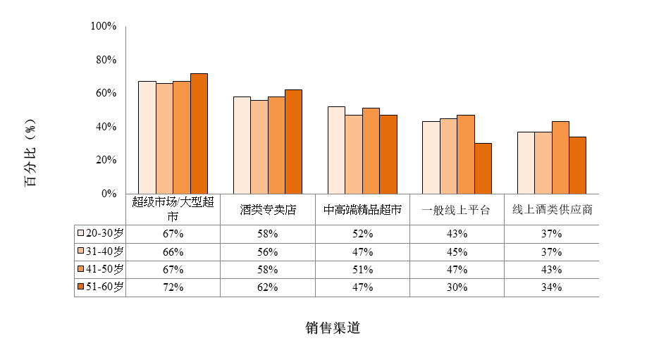 下图载列各年龄组别于不同销售渠道购买葡萄酒的百分比: