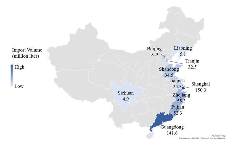 The map below sets forth the top 10 cities/provinces in terms of import volume of wine in China in 2017: