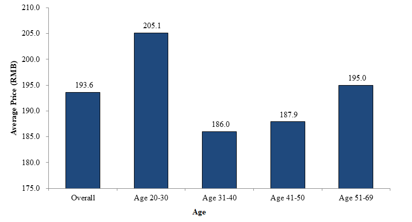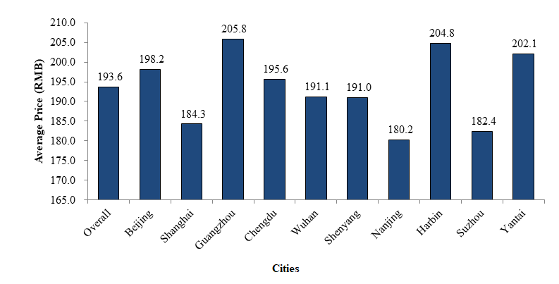 The chart below sets forth the average price of wine bought for own consumption by different cities in China: