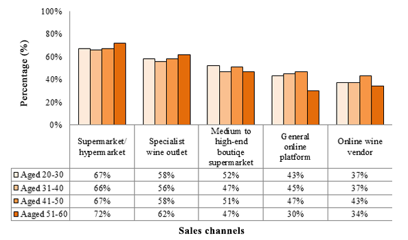 The following chart illustrates the percentage of each age group buying wine through different sales channels: